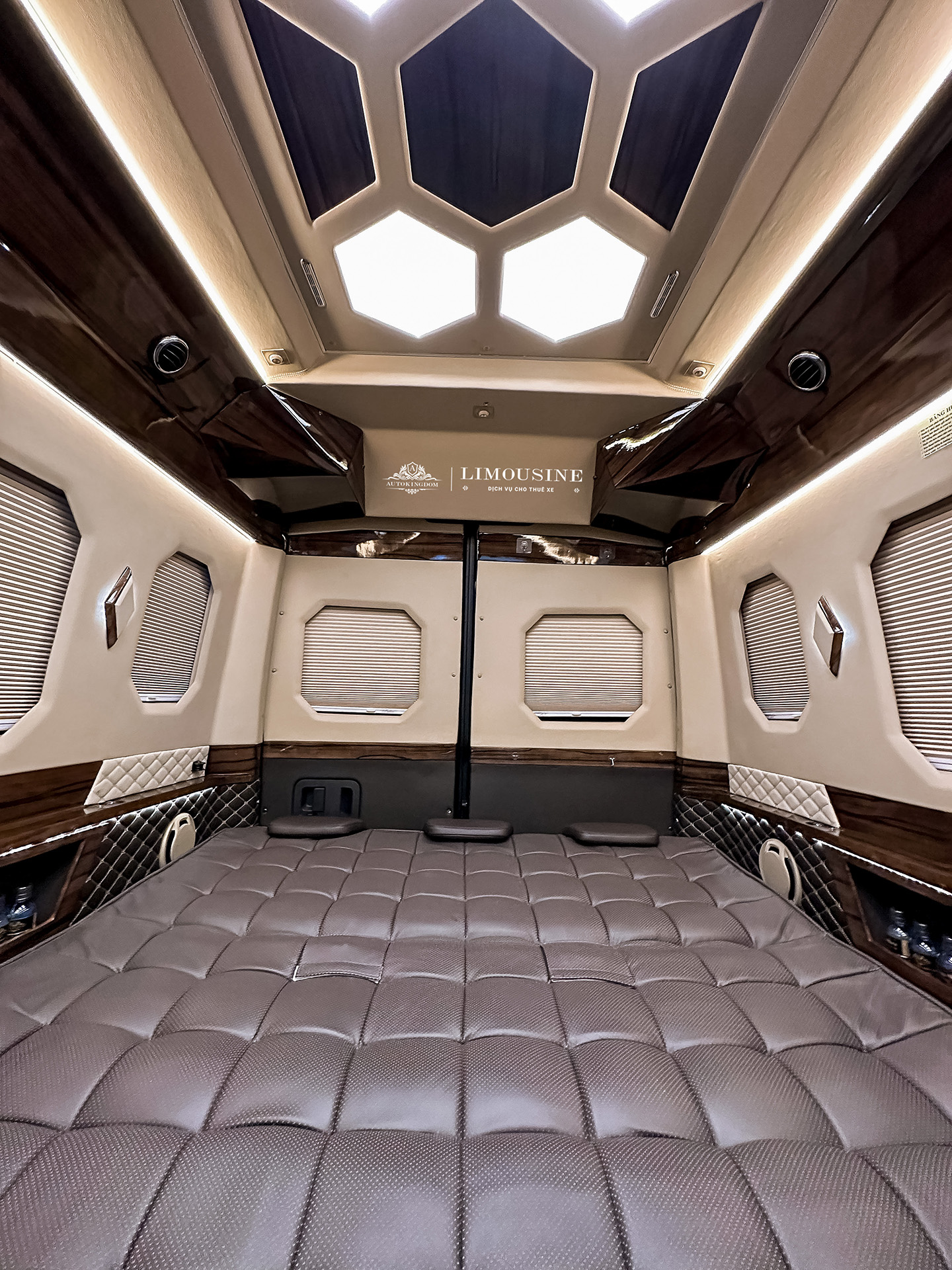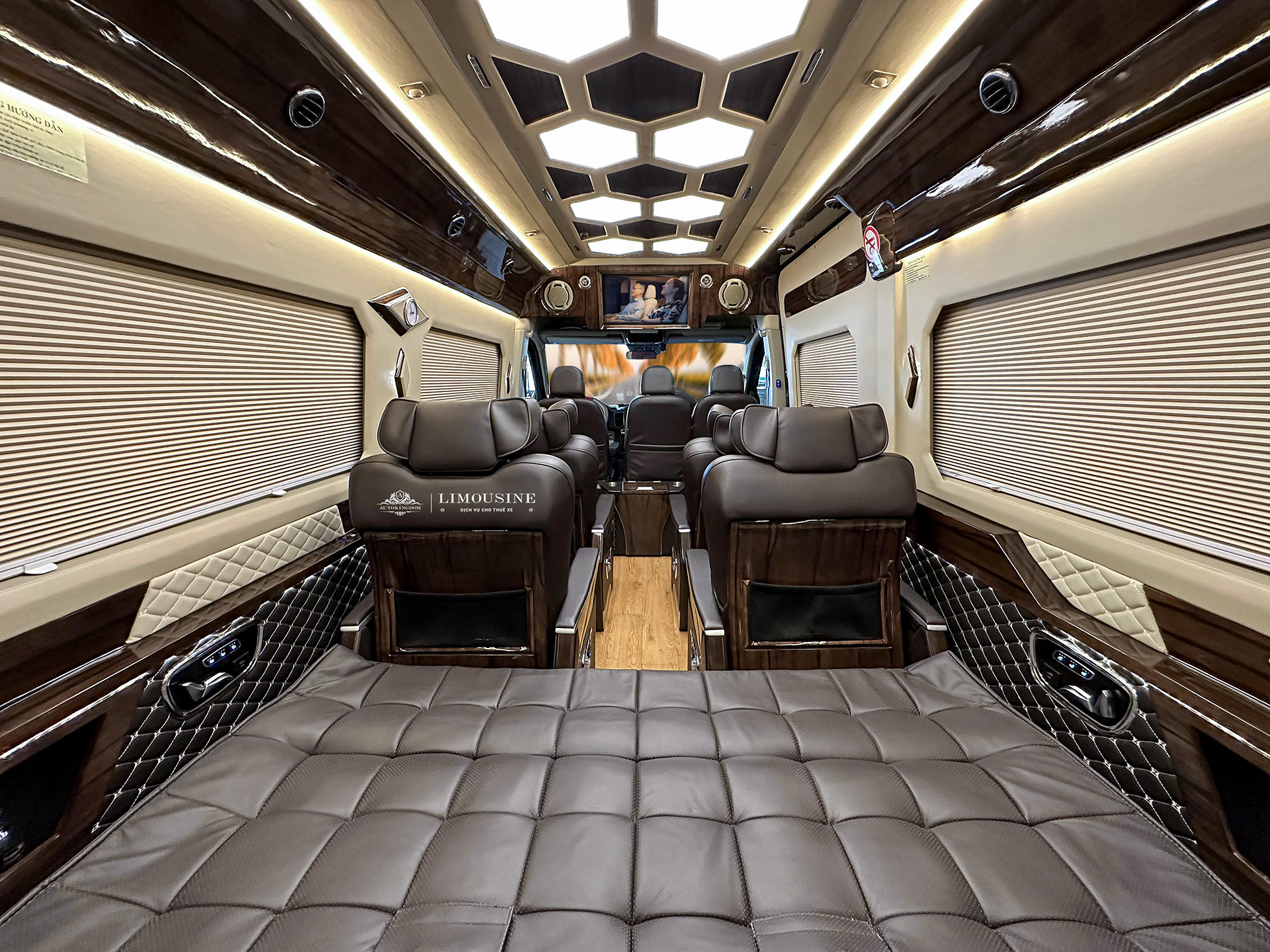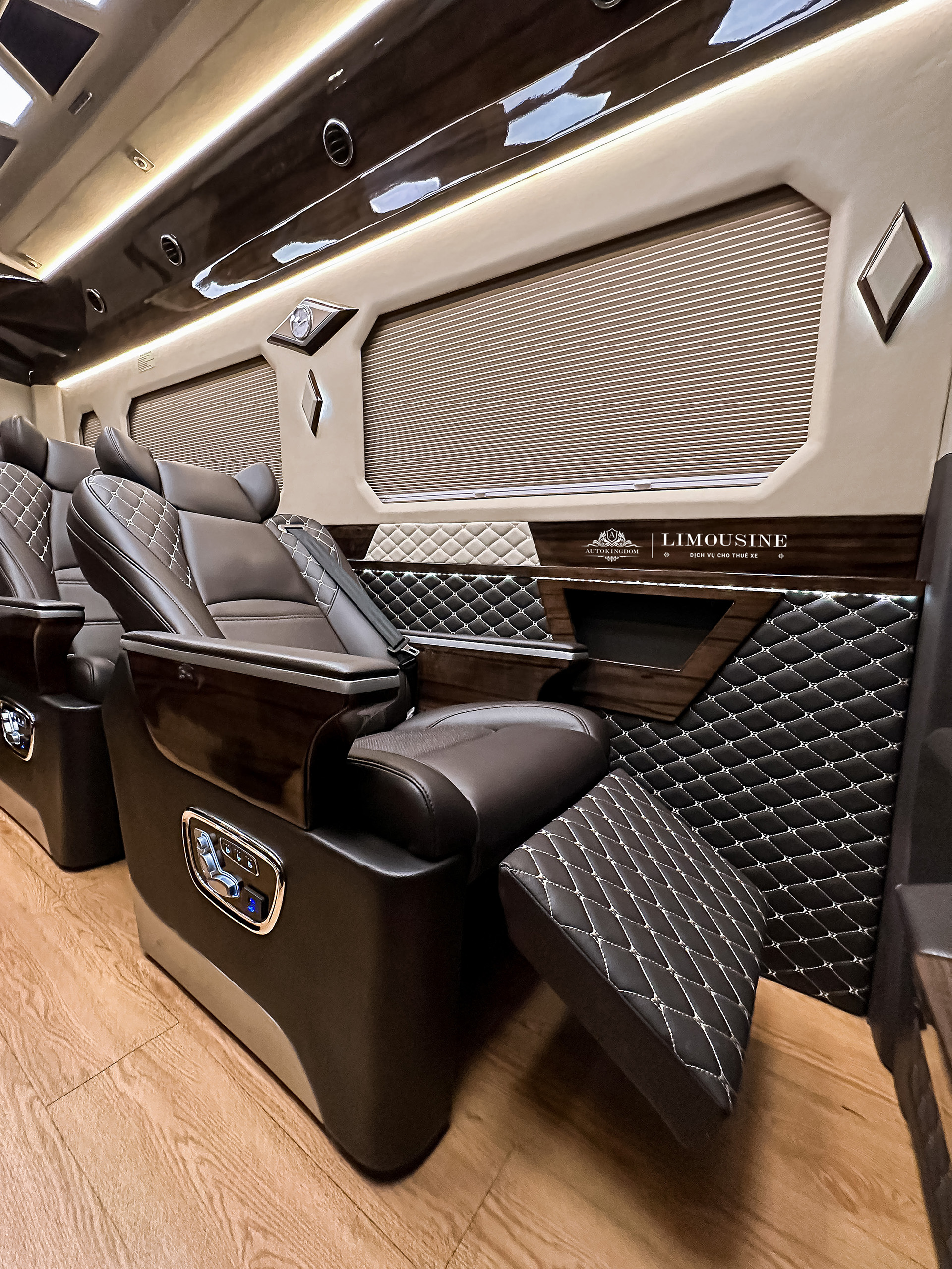 - Bệ bước tự động - Bệ để chân chỉnh điện - Bộ tem AutoKingdom - Âm thanh cao cấp - Hệ thống làm mát lưng theo lựa chọn - Hệ thống đèn LED chiếu sáng - Ổ sạc USB cho từng ghế - Ốp da công nghiệp toàn xe - Rèm cơ không dây ngăn tia UV - Sàn gỗ công nghiệp - Tủ lạnh dung tích lớn