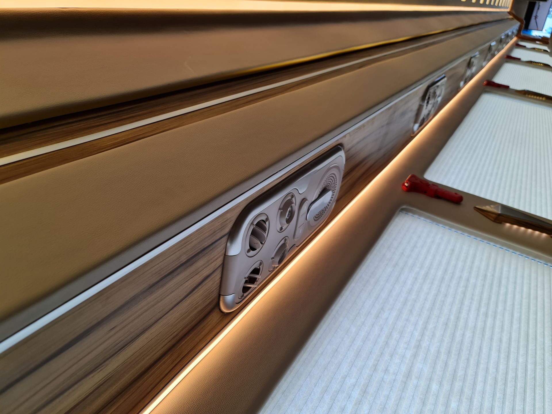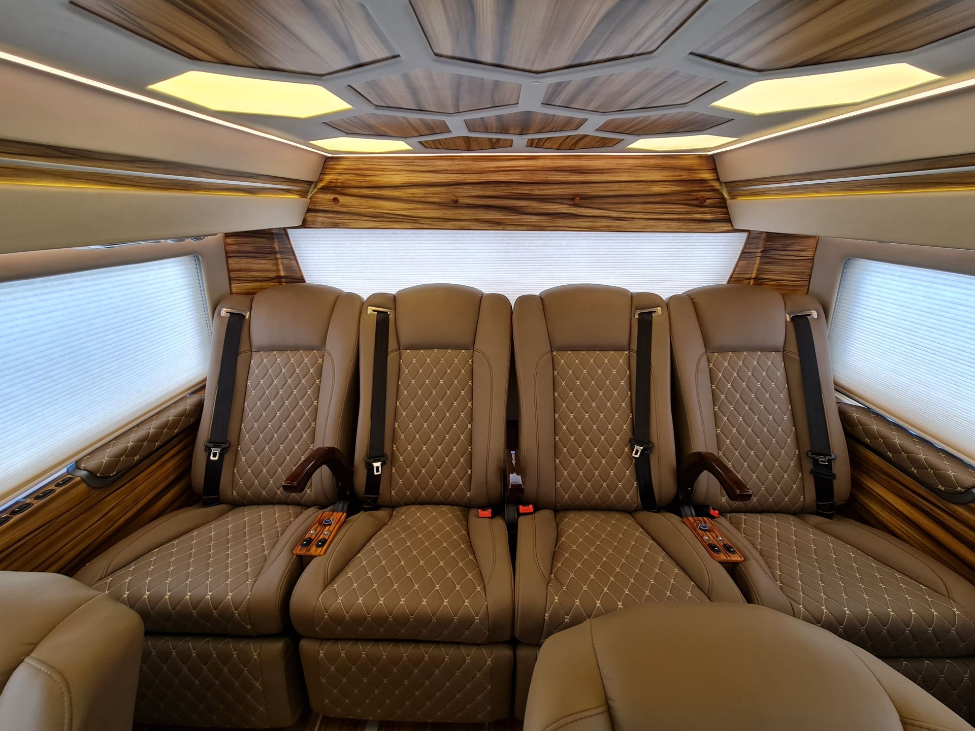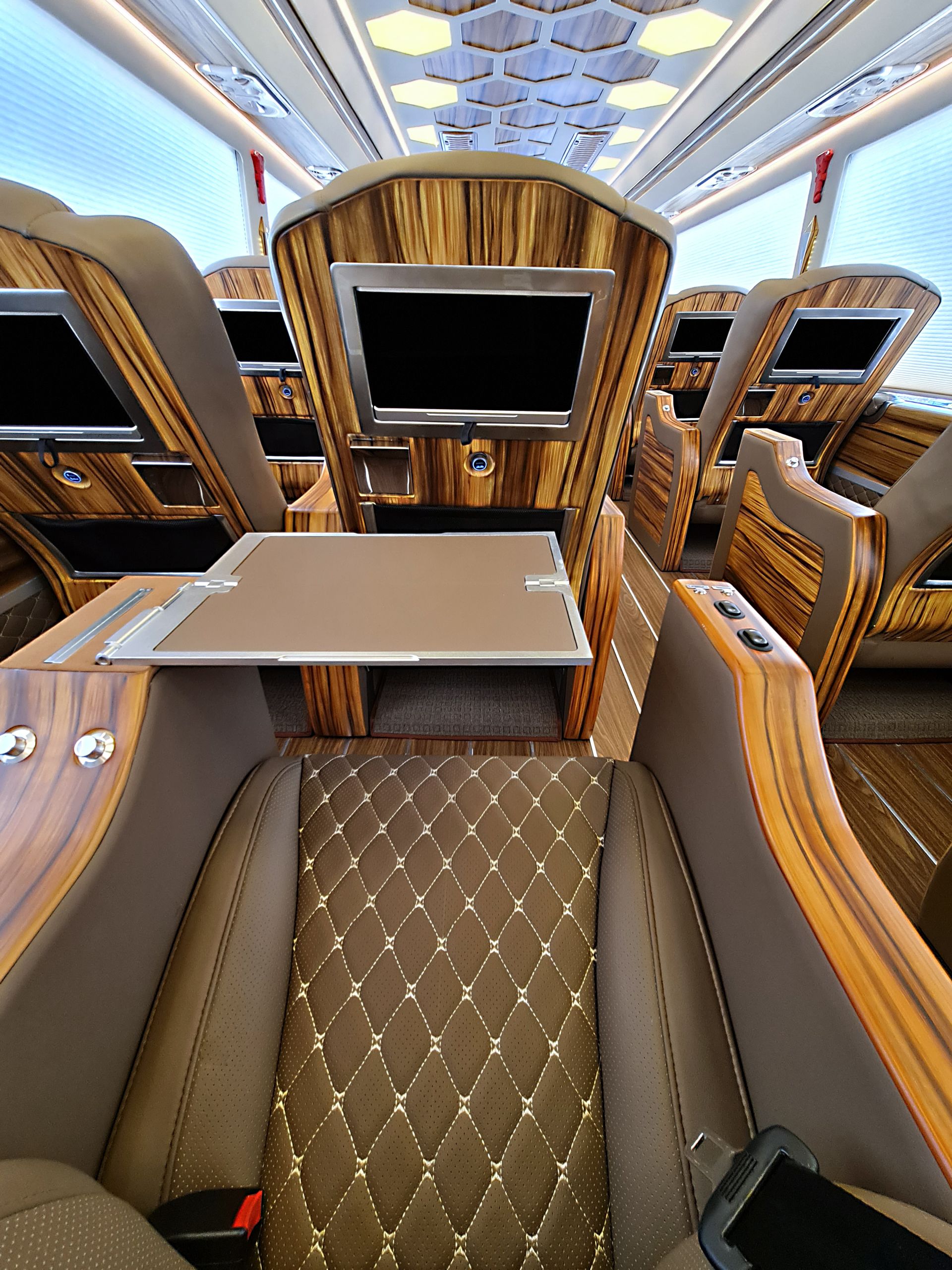 - Bệ để chân chỉnh điện - Bộ tem AutoKingdom - Âm thanh cao cấp - Hệ thống làm mát lưng theo lựa chọn - Hệ thống đèn LED chiếu sáng - Ổ sạc USB cho từng ghế - Ốp da công nghiệp toàn xe - Rèm cơ không dây ngăn tia UV - Sàn gỗ công nghiệp - Bàn làm việc tích hợp tay ghế - Tủ lạnh dung tích lớn