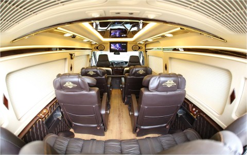 Đối với phiên bản cao cấp, bốn ghế VIP chỉnh điện kết hợp massage rung, có bệ để chân, hàng ghế thứ 3 trượt điện, vách ngăn lửng kết hợp màn hình 21 inch phía trên, trang thiết bị âm thanh Alpine + đầu DVD Pioneer 1 đin nhập khẩu, camera lùi hỗ trợ thu hình ảnh bằng màn hình gương chiếu hậu, hệ thống đèn chiếu sáng toàn xe sử dụng công nghệ LED với chức năng tùy chỉnh thông minh cùng trang thiết bị tiện ích cho hành khách như: Rèm cửa cơ nhập từ Mỹ chuyên cung cấp cho máy bay và du thuyền, tủ làm mát 21 lít tiện nghi, 5 USB sạc điện + ổ nguồn 220V + bộ chuyển đổi điện 500W và thay kính liền theo phiên bản Luxury.